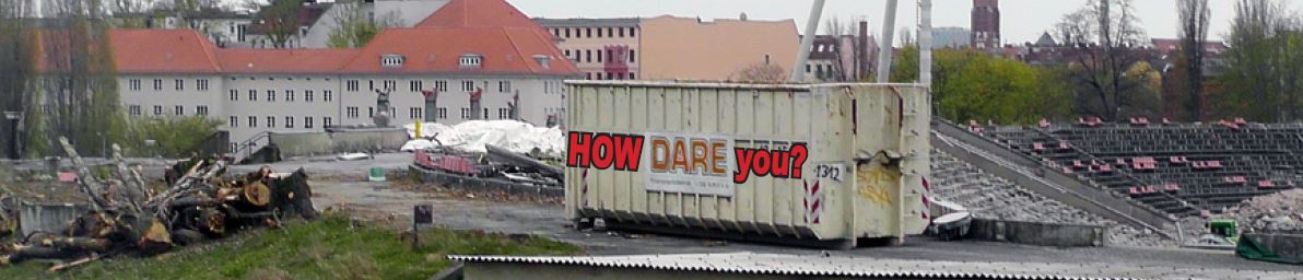 Nun ist im Wettbewerb der Totalabriss beschieden worden. Der Neubau verschlingt Unmengen Rohstoffe und Energie und setzt massenhaft klimaschädigende Stoffe frei. Und das, obwohl diese Umweltsünde mit nur geringen Abstrichen an die hoch gesetzten Ziele an das Stadion durch Nachnutzung vermeidbar gewesen wäre.